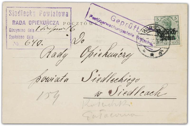 1917, Postkarte mit 7½ Pfg. Germ. Gen.-Gouv. ab Warschau 25.10.17 nach Siedlce. Dort mit Zustellgebührstempel =10 Pfg.= rot - Text an den Städtischen Wohlfahrtsrat /Bürgerbetreuung. Fotoattest Petriuk. (Image)