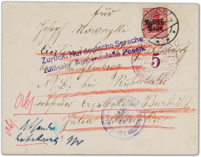 1916, Brief mit 10 Pfg. Germ. Russ.-Polen ab Czenstochau 5.1.16 nach Senftenberg. Bei der Prüfungs- und Überwachungsstelle V. AK Posen wurde der Brief =Zurück Nur deutsche Sprache zulässig beanstandet. Nach Warschau an Ausschuss für unzustellbare Postsendungen weitergesandt. Nach Hinzufügung des Abs. Czenstochau mit Stadtpoststempel Nr. 2 b mit =5= (Image)