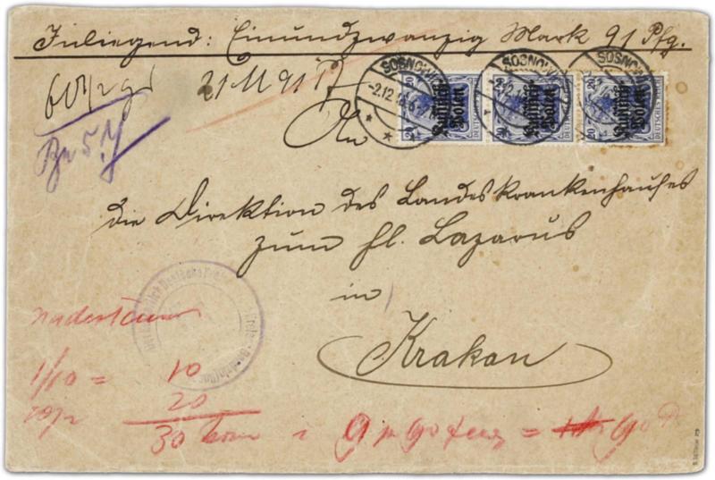 1916, WERTBRIEF 60,5 g / 21 Mark - Gebühr über 75 km 60 Pfennig - mit 3 X 20 Pfg. Germ. Russ.-Polen (einmal gelbfleckige Zähnung) ab Sosnowice 2.12.16 nach Krakau. RS mit Stempel Breslau BPA 5 3.12.15 (Jahreszahl verm. Fehleinstellung). Wertbriefe aus dem GG Warschau sind bisher unbekannt. Sign. und Fotoattest Petriuk. (Image)