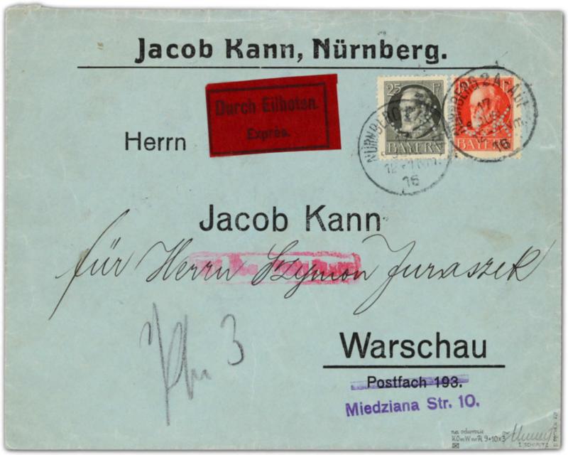 1916, Firmenumschlag als Eilbrief mit 10 und 25 Pfg. König Ludwig III. mit Lochung =J.K.= ab Nürnberg 2 A 17.Jun. 16 nach Warschau. PÜ Posen rot. In Warschau auf RS Zustellgebührenmarken 3 X 6 Gr. und 1 X 2 Gr. Mi-Nr. 9 a + 10 b(3). Abs.-Lasche fehlt, aber Marken mit Stempel komplett. Sign. Schmutz und Petriuk, Fotoattest Petriuk. (Image)