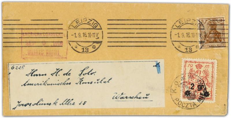1916, Streifband Drucksache mit 3 Pfg. Germ. als EF ab Maschinenstempel Leipzig 13 1.9.16 nach Warschau an Amerik. Konsulat. Keine Zensurvermerke. In Warschau Stadtpost mit Marke 2 Gr. auf 10 Gr. Mi-Nr. 9 a mit Stempel - dazu Eingangsstempel rot: American Consulate Warschau / Russland. Es gibt nur wenige Streifbänder mit Stadtpostmarken. Sign. und Fotoattest Petriuk. (Image)