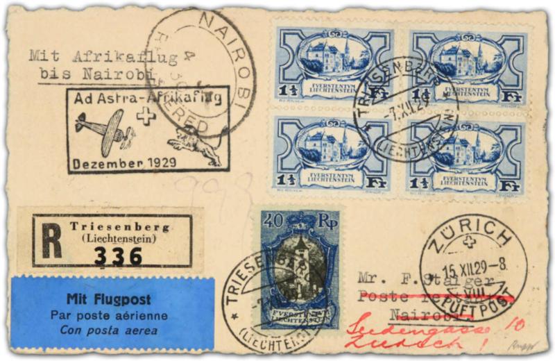 1929, AD-ASTRA Afrikaflug, Etappe bis Nairobi, Liechtenstein-Post, R-Karte ab Triesenberg 7.12.29 via Zürich 15.12. nach Nairobi 4.1.30, retour nach Zürich 7.2., Fotoattest Rupp (Image)