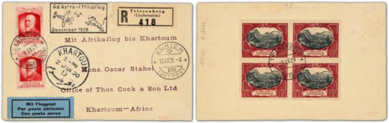1929, II. Schweizer Afrikaflug, Etappe Zürich - Karthoum, beidseitig frankierte R-LP-Karte u.a. rs. Viererblock Mi-Nr. 60 ab Triesenberg 9.12.29 via Zürich 15.12. nach Karthoum 2.1.30, SLH 29.12.dL (Image)