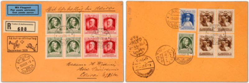 1929, II. Schweizer Afrikaflug, Etappe Zürich - Kairo beidseitig wertvoll frankierter R-Brief u.a. Viererblock Mi-Nr. 93, ab Vaduz 7.12.29 via Zürich 15.12. nach Kairo 18.12., SLH SF 29.12.cL (Image)