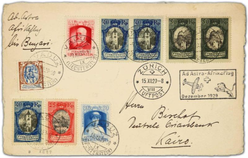 1929, II. Schweizer Afrikaflug, Etappe Zürich - Bengasi, üppig frankierte R-Karte ab Vaduz 9.12.29 via Zürich 15.12. nach Bengasi 17.12., adressiert nach Kairo 18.12., kleine Transportspuren, SLH SF 29.12.bL (Image)