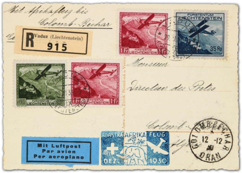 1930, III. Schweizer Afrikaflug vom 2.12.1930, 5 Etappenbelege ab Liechtenstein nach Perpignan, Alicante, Fez, Colomb Béchar und Gao, SLH SF 30.12 aL - eL (Image)