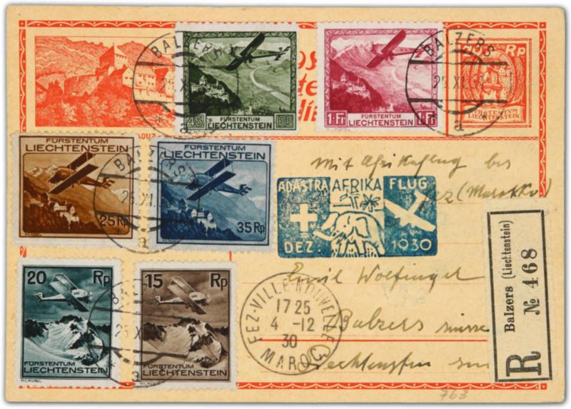 1930, III. Schweizer Afrikaflug, Etappe Zürich - Fez, GA-Karte mit herrlicher Zusazfrankatur ab Balzers 25.11.29 via Zürich nach Fez 4.12., adressiert nach Balzers 9.12., SLH SF 30.12 cL (Image)
