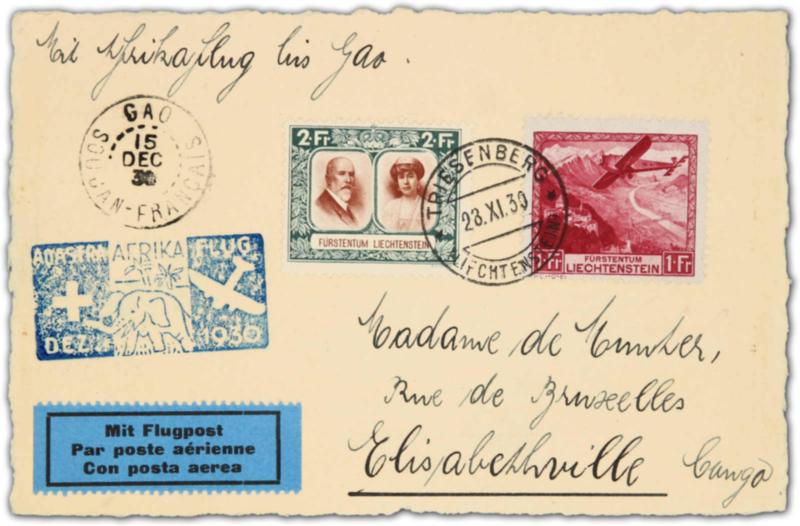 1930, III. Schweizer Afrikaflug, Etappe Zürich - Gao, Karte ab Triesenberg 28.11.29 via Zürich nach Gao 15.12., adressiert nach Elisabethville, Congo, SLH SF 30.12 eL (Image)