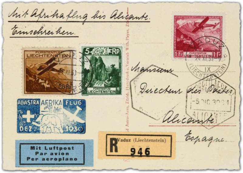 1930, III. Schweizer Afrikaflug, Etappe Zürich - Cartagena / Alicante, R-Fotokarte ab Vaduz 29.11.29 via Zürich nach Alicante 4.12. / Cartagena 5.12. SLH SF 30.12 bL (Image)