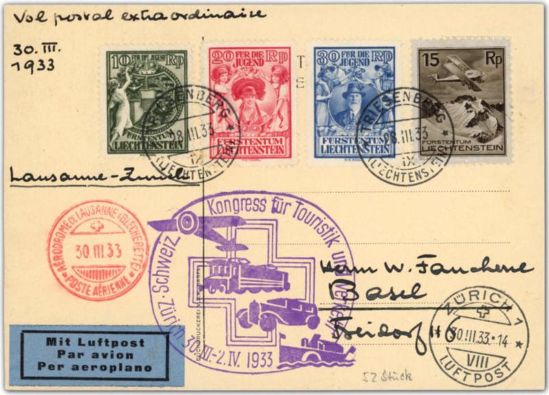 1933, Tourismus- und Verkehrskongress, Fotokarte ab Triesenberg 28.3.33 via Lausanne 30.3. nach Zürich 30.3., adressiert nach Basel, SLH: SF 33 d FL (Image)