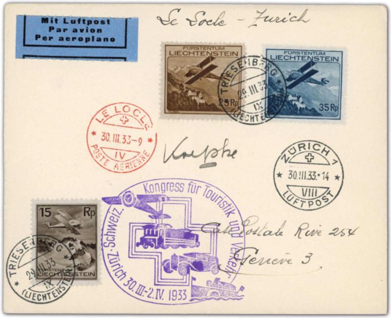 1933, Tourismus- und Verkehrskongress, Brief ab Triesenberg 29.3.33 via Le Locle 30.3. nach Zürich 30.3., adressiert nach Genf, SLH: SF 33 c FL (Image)