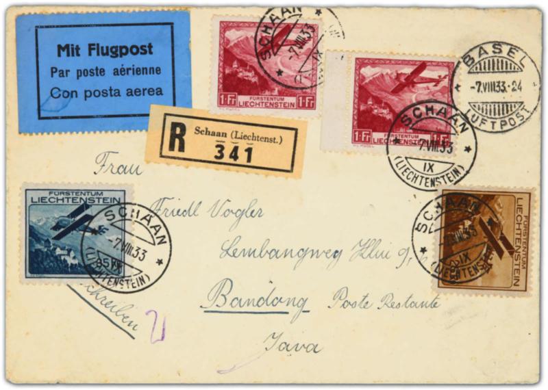 1933, R-LP-Brief ab Schaan 7.8.33 mit wertvoller Flugpostmarkenfrankatur von 2,60 FR. via Basel 7.8. nach Bandong/Java, Niederländisch Indien 18.8., Transportspuren (Image)
