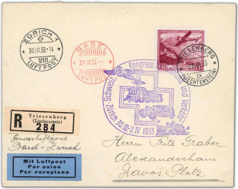1933, Tourismus- und Verkehrskongress, Brief ab Triesenberg 28.3.33 via Bern 30.3. nach Zürich 30.3., adressiert nach Basel, SLH: SF 33 f FL (Image)