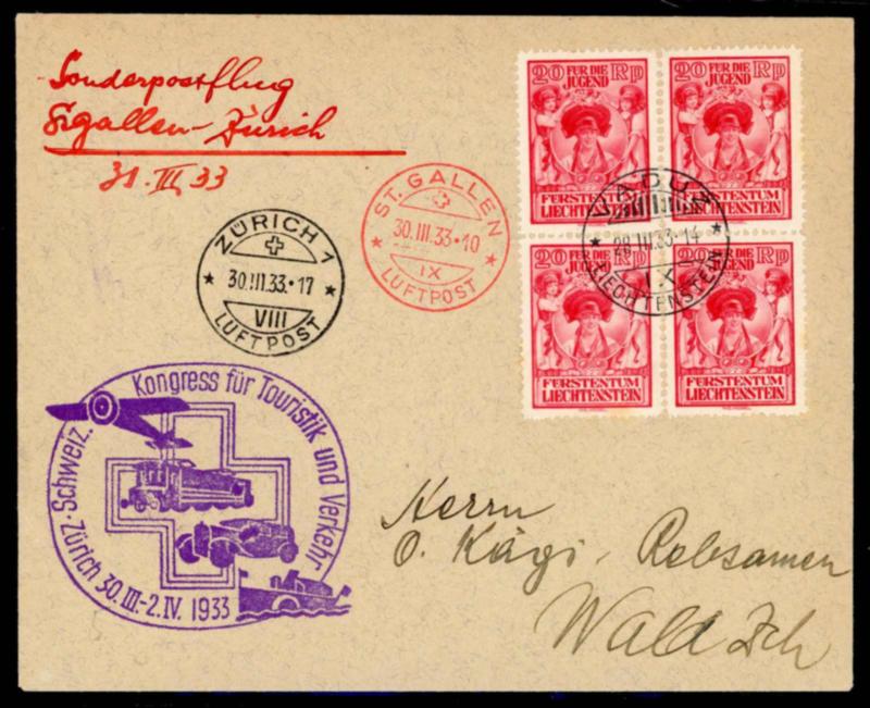 1933, Tourismus- und Verkehrskongress, Brief ab Vaduz 28.3.33 via St. Gallen 30.3. nach Zürich 30.3., adressiert nach Wald, SLH: SF 33 g FL (Image)
