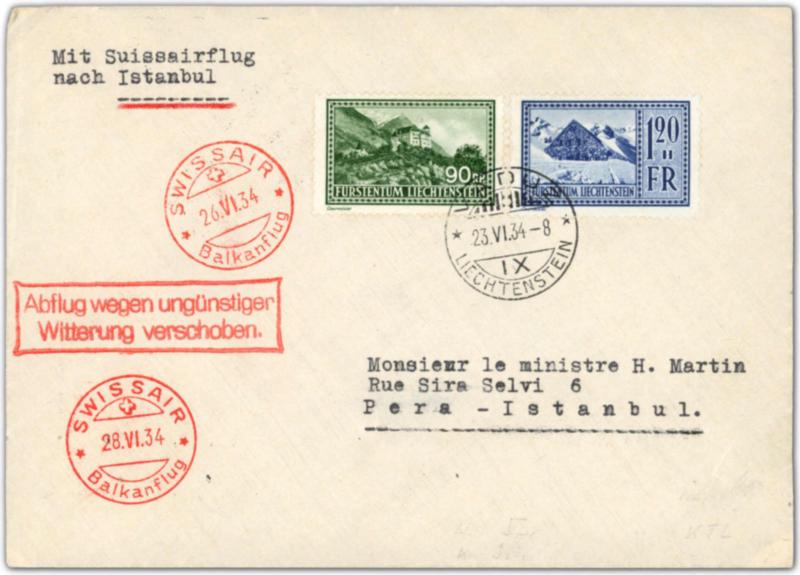 1934, SWISSAIR Balkanflug, Etappe Zürich - Istanbul, Brief ab Vaduz 23.4.34 mit rotem Flugbestätigungsstempel vom 26.6. nach Beyoglu 28.6., SLH: SF 34.3 cL (Image)