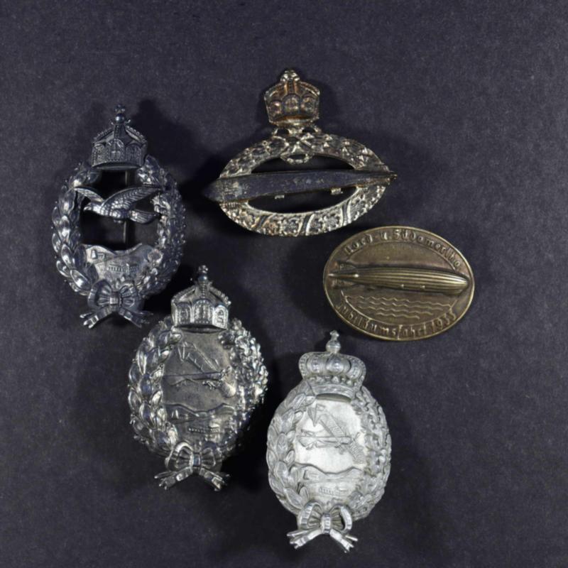 Fliegerabzeichen 1. Weltkrieg, 4 Stück (mindestens 2 Göde-Repliken), dazu Anstecker Zeppelin Nord- und Südamerikafahrten/Jubiläumsfahrt 1933 und filigranes Zeppelin-Modell (Aufsteller), ca. 12 X 2 cm (Image)