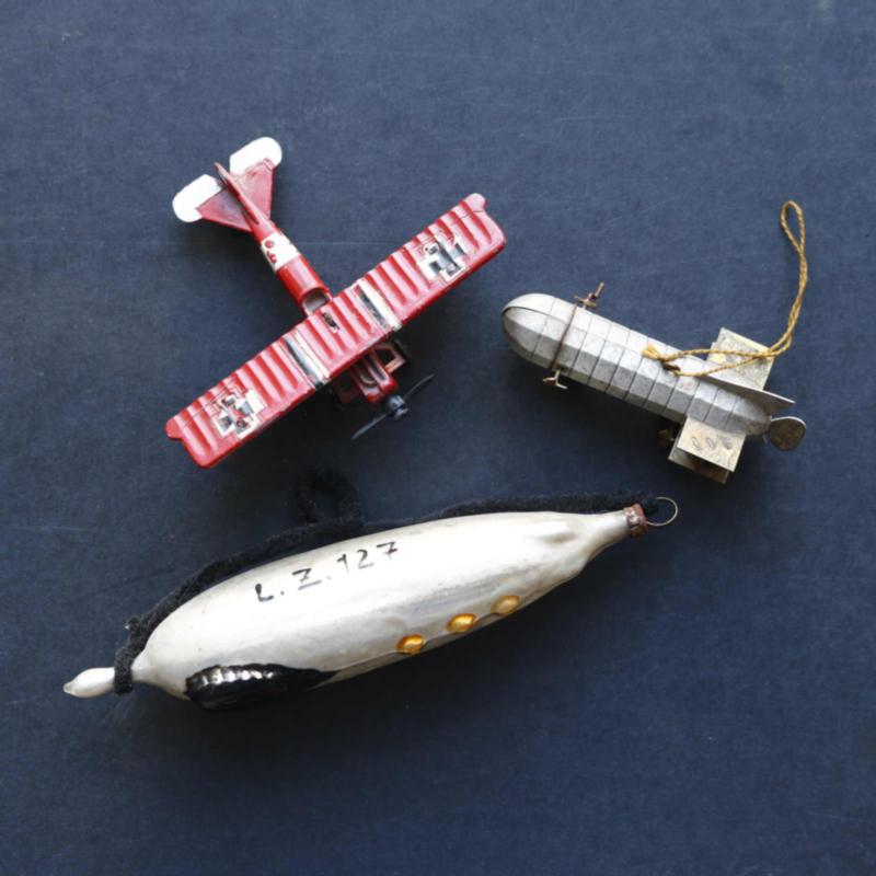 3 Modelle Luftfahrt: LZ 127 ca. 15 cm lang als Weihnachtsbaumschmuck, metallener Zeppelin, 8,5 cm lang, Zweigondelschiff mit Laufgang, innenliegend Maßband - direkt aus dem Bug ausziehbar oder über die beiden Luftschrauben aus- und aufwickelbar sowie Metalldoppeldecker ca. 8,5 x 10 cm, wohl vom "Roten Baron" (Image)