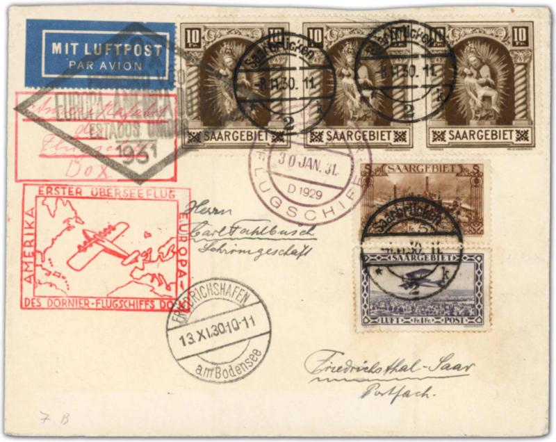 1930, Zuleitungspost SAAR, Brief ab Saarbrücken 8.11.30 mit wertvoller Frankatur via Friedrichshafen 13.11. nach Rio de Janeiro 22.4.31, adressiert nach Friedrichsthal-Saar, etwas fleckig und z.T. gebräunte Zähnung (Image)