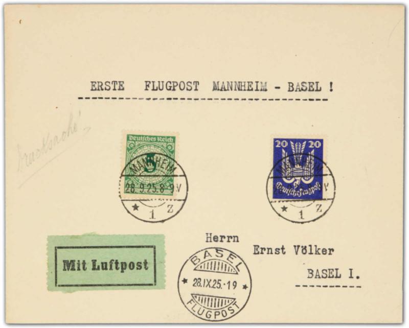1925, Erstflug Mannheim - Basel, Drucksache vom 28.9.25 mit Ankunftsstempel Basel 28.IX.25-19 (Image)