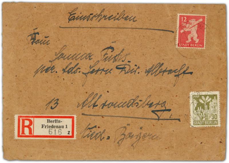 1945, 30 Pfg. durchstochen mit 12 Pfg. gezähnt tarifgerecht auf R-Brief ab "BERLIN-FRIEDENAU 1ad 9.12.45-19" nach Altrandsberg, Umschlag mit Transportspuren, sonst einwandfrei, Fotobefund Dr. Jasch BPP (ME 400,-) (Image)