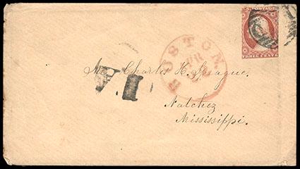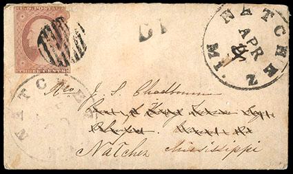 Symbol:"1A" of Natchez, Miss. Bold large advertising handstamp on incoming cover, franked with narrowly cut 1851, 3¢ dull red (11A) tied by large "Paid" in grid handstamp, red "Boston, Apr 22" origin cds; some cover edge wear and portions of backflap missing, F.-V.F., a rare auxiliary rate marking, featured in Milgram's "Unusual Natchez 1 Handstamps" in the Chronicle (May 2020). Estimate; $200 - 300. US$200-300 (Image)