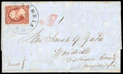 Symbol:"A1" of Woodville, Miss. Red advertising handstamp with manuscript rating on incoming folded letter, franked with 1851, 3¢ reddish orange brown (10) tied by "Alexandria, La., Oct 13" cds, letter with interesting content regrading plantation slaves…The children all appeared delighted with their trip up and all they have seen, and all the negroes appeared rejoiced to see them again…There is not a case of sickness now on the plantation. The negroes have all more or less had colds from unavoidable exposure during bad weather while I was absent but all are now well & at work…The negroes are all fat & healthy & in the finest spirits & rejoice at the prospect of making a fine crop. The whip is scarcely ever used because there is scarcely ever any necessity for it., Very Fine, a rare auxiliary marking and interesting slave letter. Estimate; $400 - 600. US$400-600 (Image)