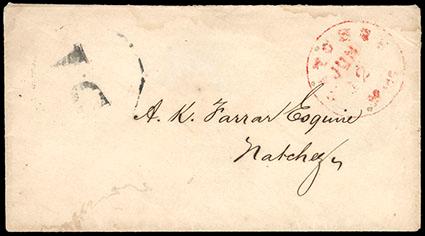 Symbol:"D1" in Circle of Natchez, Miss. Large drop rate handstamp on locally addressed cover, with red "Natchez, Miss., Jun 12" cds; some light cover staining, F.-V.F., believed to be the only example of this auxiliary rate marking, featured in Milgram's "Unusual Natchez 1 Handstamps" in the Chronicle (May 2020). Estimate; $300 - 400. US$300-400 (Image)