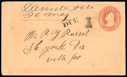 Symbol:"Due 1" of Danville Hill. Vt. Bold "Due" straightline handstamp and large "1" on 1853-55 3¢ Nesbitt entire postmarked "Danville Hill 26 May" (Vt) manuscript town, reverse with neat grid cancel on backflap, Very Fine, unusual and most probably a "Way" rate. Estimate; $100 - 150. US$100-150 (Image)