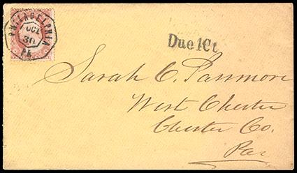 "Due 1Ct" of Philadelphia, Pa. Bold and complete straightline for carrier service on cover to West Chester, Pa, franked with 1857 3¢ tied by octagonal "Philadelphia, Pa, Oct 30" postmark, Very Fine and attractive,ex-Meyersburg. Scott No. 26; Estimate $100 - 150. US$100-150 (Image)