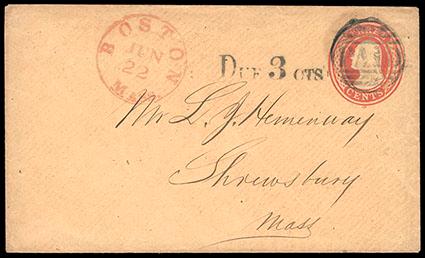 "Due" markings on 1851-57 Issues. Group of 7 folded letters's/covers, all with various 1¢-5¢ "Due" markings, most with 1851-57 3¢ stamps but note 1857 1¢ with Providence, R,I (Due 2), others include: Bangor "Due 3 cts", Boston "Due 1" and "Due 3", Boston ornate "Due 5" in circle Philadelphia blue "5 Cts, Due", additional strike in black on folded letters, minor stamp/cover flaws or small faults, F.-V.F., still attractive group. Scott No. 11 (3), 24, 26 (3); Estimate $200 - 300. US$200-300 (Image)