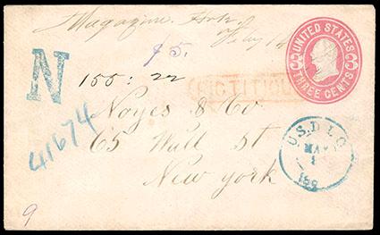 "Ficticious". Light but complete red straightline handstamp on 3¢ entire to New York, postmarked scarce Magazine, Ark, manuscript, struck with blue "U.S.D.L.O." double circle & large matching "N" and blue crayon "41674" at left, additional purple "$5", Very Fine, unusual markings, extremely scarce. Scott No. U58; Estimate $150 - 200. US$150-200 (Image)
