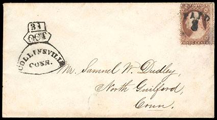 "Axe" of Collinsville, Ct. Two covers, each with different types of fancy "Axe" cancels, each franked with 1857 3¢, first postmarked large "Axe" with integral date and town with centrally struck "Paid 3" on stamp, other with small "Axe" only (S-E PO-Wt 6) cancelling stamp and Collinsville, Conn, cds at left, Very Fine, large Axe cover with 1995 P.F. Cert. stating "stamp with a small stain at bottom right which has been partially removed". Scott No. 25, 26; Estimate $200 - 300. US$200-300 (Image)
