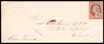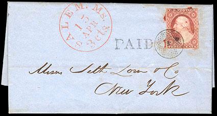 "Geometric" of Salem, Mass. Choice strike of Spiral of Dots in Circle fancy cancel (Skinner-Eno GE-E 25) tying 1851 3¢ type II on 1852 folded cover to New York, postmarked red "Salem, Ms 15 Apr" cds with integral "3 cts" and bold "Paid" straightline, stamp affixed with red sealing wax (unusual), Very Fine, extremely attractive, with 2010 P.F. certificate. Scott No. 11A; Estimate $150 - 200. US$150-200 (Image)