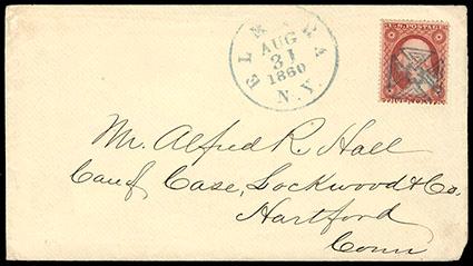 "Maltese Cross" of Elmira, N.Y. Bold and complete full strike in blue, centrally struck on 1857 3¢ Dull Red, type III on cover to Hartford, Ct, postmarked matching blue "Elmira, NY Aug 31 1860" cds, Extremely Fine, gem strike on exceptionally clean cover. Scott No. 26; Estimate $200 - 300. US$200-300 (Image)