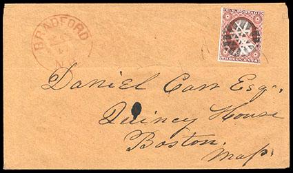 Geometric of Bradford, N.H. Bold and complete strike, centrally struck on 1851 3¢ type II, on cover to Boston, Mass, postmarked red "Bradford, N,H," cds, light horizontal fold (not detracting or affecting), adhesive with four margins and pronounced double transfer at bottom, Very Fine and choice. Scott No. 11A; Estimate $100 - 150. US$100-150 (Image)
