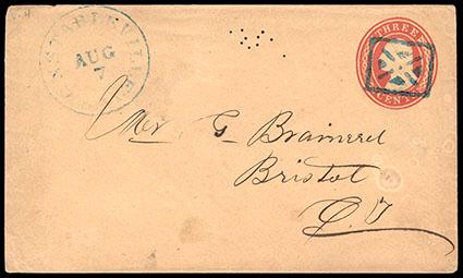 Geometric of Constableville, NY. Wonderful strike of blue boxed fancy on 1853-55 3¢ Nesbitt entire to Bristol, R,I, postmarked matching "Constableville NY Aug 7" cds at left, Very Fine and choice. Scott No. U10; Estimate $150 - 200. US$150-200 (Image)