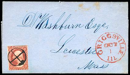 Geometric of Griggsville, Ill. Bold strike on 1851, 3¢ Deep Orange Brown in at top & bottom, deep rich color, not tied on 1851 folded cover to Leicester, postmarked bold red "Griggsville, Ill Oct 1" cds, Very Fine and attractive, impressive and desirable cover, pencil notation on reverse states, "Copper Brown". Scott No. 10; Estimate $150 - 200. US$150-200 (Image)