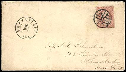Geometric of Naperville, Ill. Fancy grid (S-E SO-G 123) ties 1857 3¢ Dull Red on cover to Schenectdy, N,Y, postmarked "Naperville, N,Y, 16 Jul 1861" double circle, cover with couple small repairs at top, still Very Fine. Scott No. 26; Estimate $100 - 150. US$100-150 (Image)