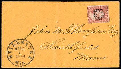 "Geometric" of Stillwater, Min. Gem strike of fancy floral design (S-E GE-C 4) on 1857 3¢ Dull Red on cover to Maine, postmarked matching "Stillwater, Min Aug 1, 1861" cds, Extremely Fine, Gem cover. Scott No. 26; Estimate $150 - 200. US$150-200 (Image)