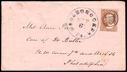 Symbol:Shield in Circle of Conshohocken, Pa. Fancy shield (S-E PS-FC 2) ties 1857 3¢ Dull Red on cover to Philadelphia with "Conshohocken, Pa, Sep, 6" cds alongside, cover with corner repair at top left, otherwise Very Fine. Estimate; $100 - 150. US$100-150 (Image)