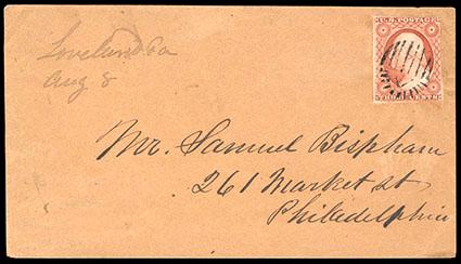 Shield of Loveland, Pa. Ornate fancy rimless shield cancels near four margin 1851 3¢ orange brown on cover to Philadelphia, Pa, manuscript Loveland, Pa, Aug, 8 postmark at top left, Very Fine and choice, scarce and attractive shield type fancy cancel. Scott No. 10A; Estimate $150 - 200. US$150-200 (Image)