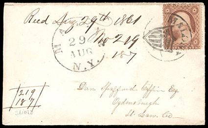 Shield of Malone, N.Y. Bold and complete Fancy Shield in Circle with "Malone" above, ties 1857 3¢ Dull Red (minor perf flaws at top) on small cover to Ogdensburgh, N,Y, postmarked "Malone, N,Y, 29 Aug" cds, docketed "1861" at top, Very Fine, a scarce fancy cancel which is unlisted in Skinner-Eno. Scott No. 26; Estimate $150 - 200. US$150-200 (Image)