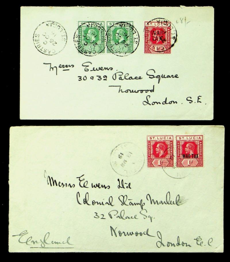 St. Lucia 2 envelopes 1916 + 1919 w/ KG V stamps to London, the second cover has a 1d stamp with 'War Tax" ovpt (Image)