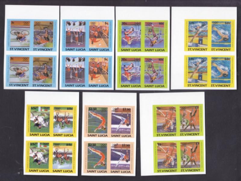 St. Vincent/ St. Lucia 1984 Olympic Games 7 Imperf marginal block of 4 unused center inverted error variety stamps (Image)