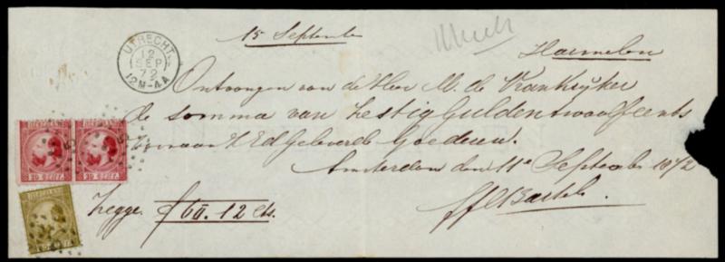 Vrijwel volledige kwitantie Harmelen via Utrecht 12.sep.1872 naar Amsterdam en aldaar voorzien van 'recht voor invordering van gelden op kwitantie' middels 2x nr.8 en 1x nr.12 (10 cent per 10 gulden of deel daarvan) met puntstempel 5 - zeer schaars (Image)