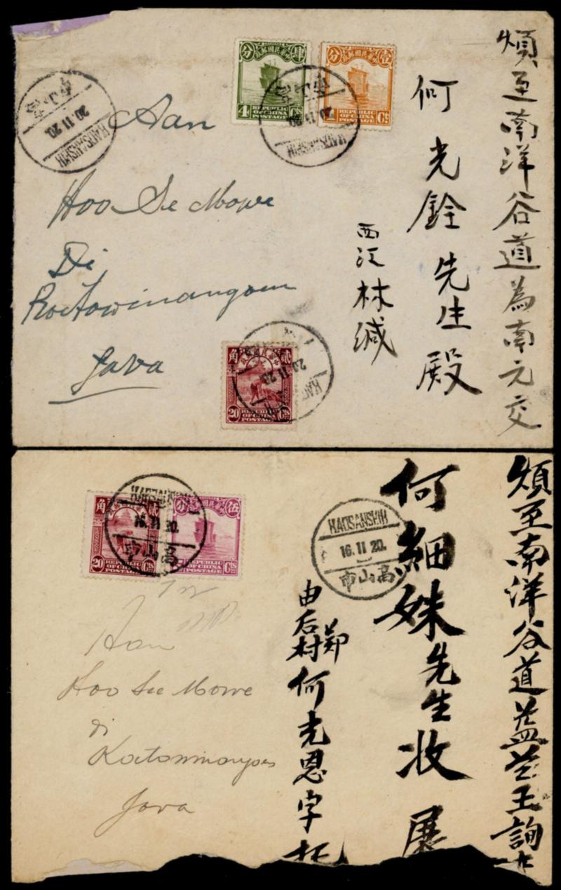 China 1931. 2 partly damaged covers from Kadsanshin to Java and a censored postcard 1941 from Peking to Netherlands. All with paper small remains on reverse. (Image)