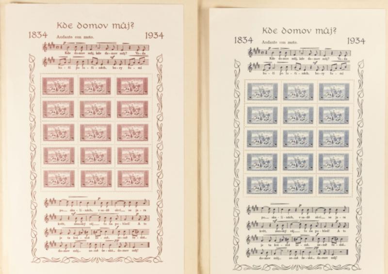 Tsjecho-Slowakije 100 Year Nationalhymne "Kde Domov Múj" Michel Nr 330x 15 in Souvenirsheet (*) and 331x 15 in Souvenirsheet (* tiny spot). (Image)