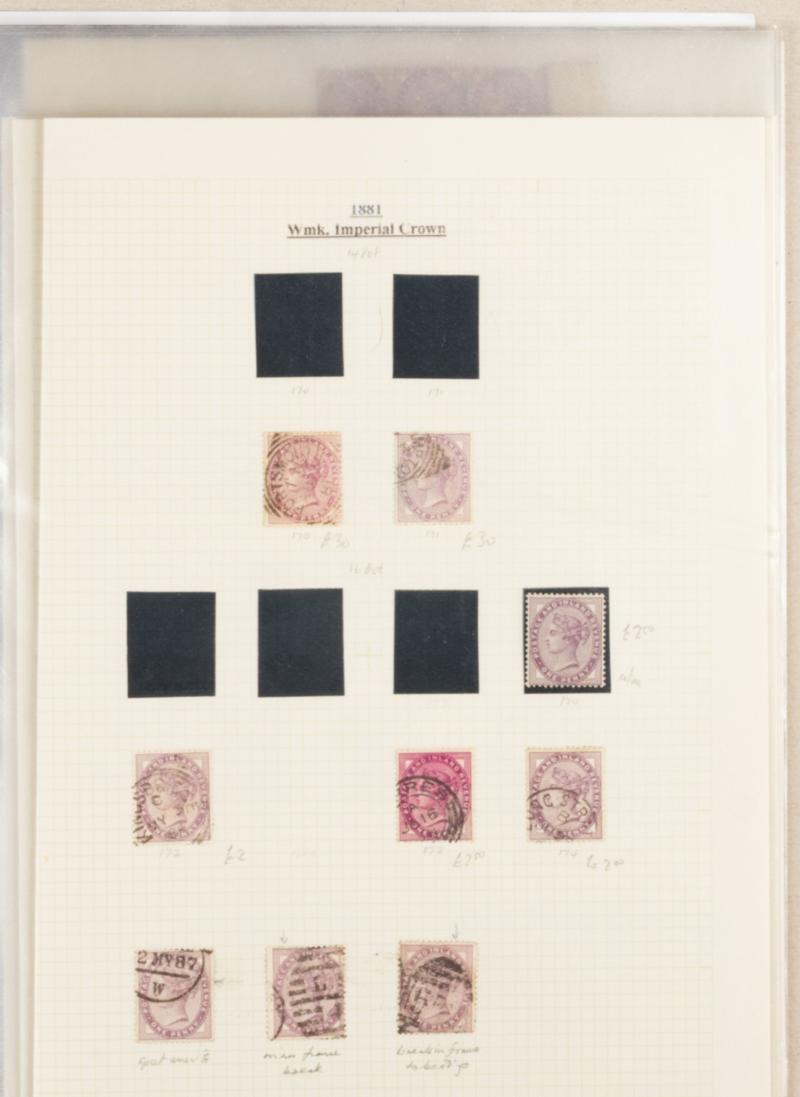 Great Britain 1881. 1 penny violet (Wm. Imperial Crown) Study collection used/mint/MNH with plate flaws (incl. SG 173b à £ 350) mint pair, mint sheet part with gutter-pairs 2 cover stc. The mint stamps are more or less toned unfortunately. (Image)