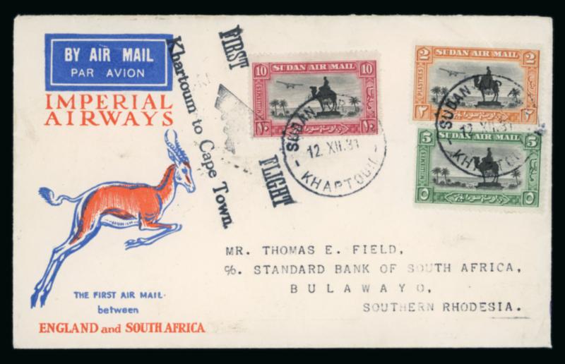 1932 (Jan.) Field Imperial Airways flight envelopes (4), one from Juba to Mbeya, Tanganyika and three from Malakal to Mbeya, Johannesburg and Victoria West, two with manuscript "Unknown return to sender", and 1935 Africa Orientale envelope from Khartoum to Berbera, Somaliland; a scarce group; also a selection of commercial flight envelopes (12) to a variety of destinations and illustrating a range of frankings (17).