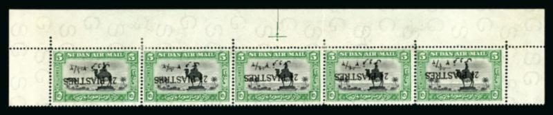 1935 Airmail 2½p on 5m black and green horizontal strip of five from the top of the sheet with full sheet margins, variety surcharge inverted, [46] showing variety small ½ and [49] variety missing Arabic "wow", fresh mint. A wonderful showpiece from the sole sheet of fifty stamps with this variety that is known to exist, the missing Arabic "wow" variety unique; cert. BPA (1949). (Image)